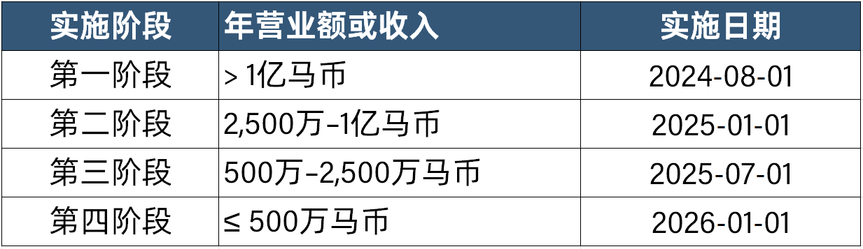 马来西亚根据企业年营业额进行分阶段实施,并设有强制实施日期,具体如下: