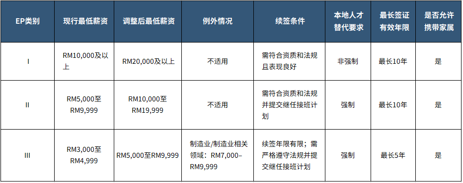 对于目前基本薪资低于RM5,000的外籍员工,如在续签前未完成薪资调整,该员工将不再具备 EP 身份的续签资格。