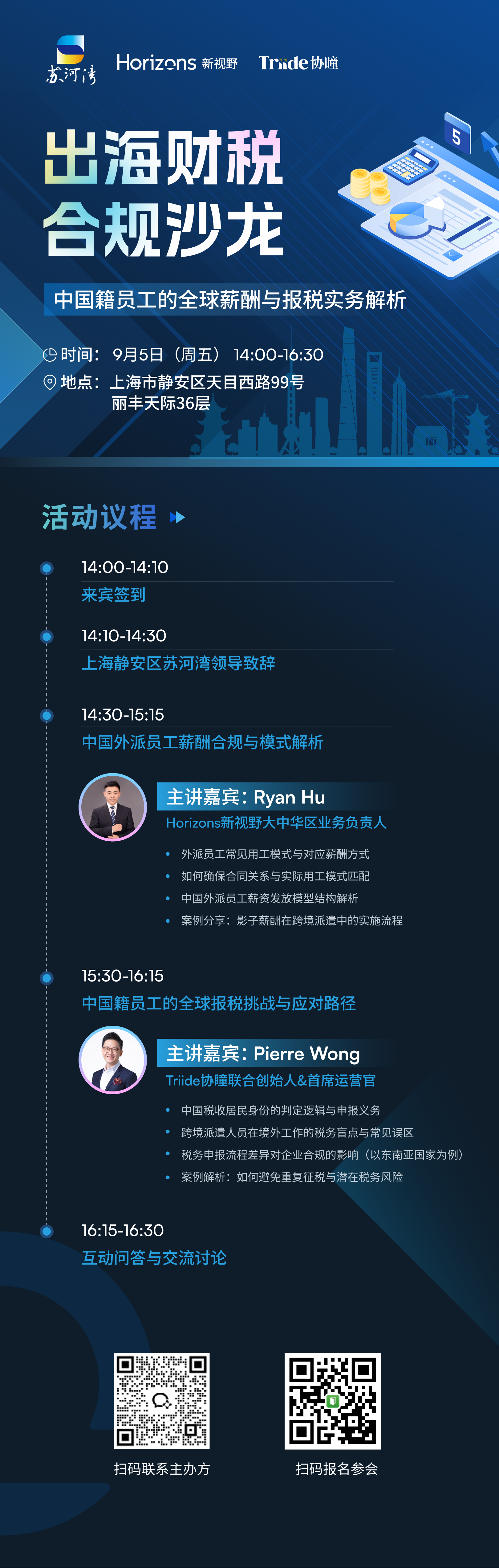 9月5日周五,Triide协曈携手上海静安苏河湾与Horizons新视野,在上海联合举办“出海财税合规沙龙”,围绕中国籍员工全球报税与境外薪酬两大核心议题,为出海企业提供跨境合规实践路径与薪酬管理解决方案。
